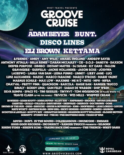 The 2027 lineup brings together artists from across house, techno, trance, melodic, bass, drum n bass and beyond. Headliners include techno kingpin and Drumcode founder Adam Beyer, Groove Cruise fan favorite BUNT., beloved fun starter Disco Lines (who just won song of the year at the EDMAs and IDMAs), hard-groove house and techno force KETTAMA, and techno trailblazer Eli Brown. They are joined by a wide-reaching cast that includes Andrew Bayer, CID, DJ Susan, Ely Oaks, Mitis, Sam Feldt, Tom Higgenson of Plain White T’s, Travis Clark of We The Kings, Trivecta, and many more.