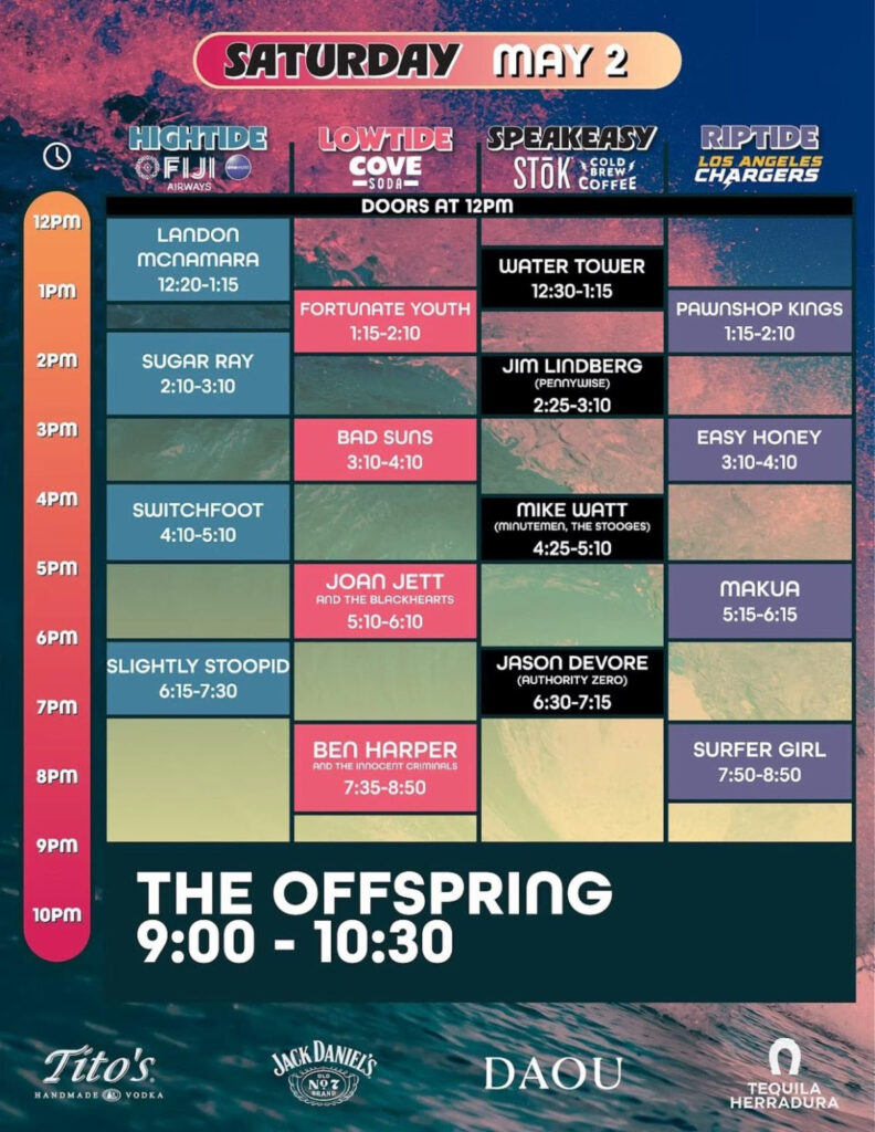 A few activations worth calling out: Fiji Airways is setting up a full Kava Bar where you can get a taste of Fijian culture — and enter to win a trip for two to Fiji. Citizens Private Bank is joining as the official financial services partner with premium main-stage views from the High Tide VIP Deck. The Aperol Garden is bringing Italian coast energy with Aperol Spritzes, Campari cocktails, and non-alcoholic Crodino right next to the music. STōK Cold Brew is presenting the SpeakEasy Stage with a vintage cold brew truck, games, and giveaways. And Cove Soda is presenting the Low Tide Stage with their zero-sugar, prebiotic lineup at the Cove Soda Shoppe.